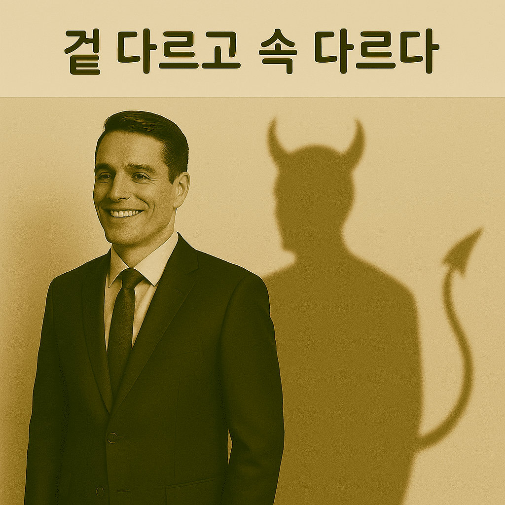 “겉 다르고 속 다르다”는 속담은 말 그대로, 겉으로 드러나는 말이나 행동과 실제 마음속 생각이 다르다는 뜻입니다. 즉, 겉으로는 좋은 척, 친한 척, 착한 척 하지만 실제로는 속으로 다른 생각을 하고 있거나 이기적인 계산을 하고 있는 사람을 비판하는 표현이죠.